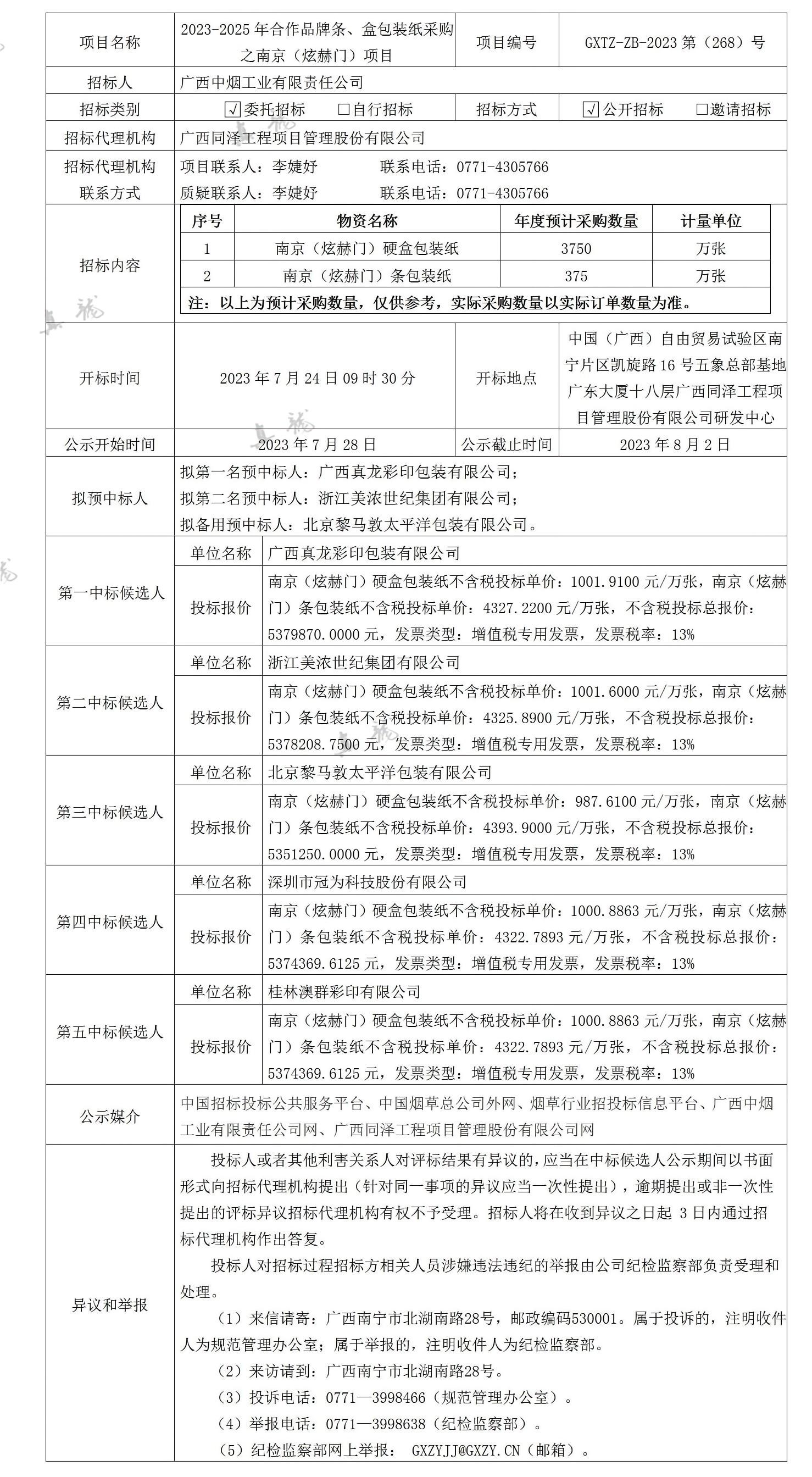 廣西中煙工業(yè)有限責(zé)任公司2023-2025年合作品牌條、盒包裝紙采購之南京(炫赫門)項目(項目編號:GXTZ-ZB-2023第(268)號)中標候選人公示
