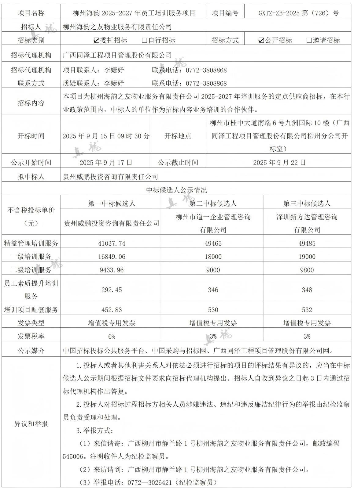 柳州海韻之友物業(yè)服務(wù)有限責任公司柳州海韻2025-2027年員工培訓(xùn)服務(wù)項目(項目編號:GXTZ-ZB-2025第(726)號)中標候選人公示