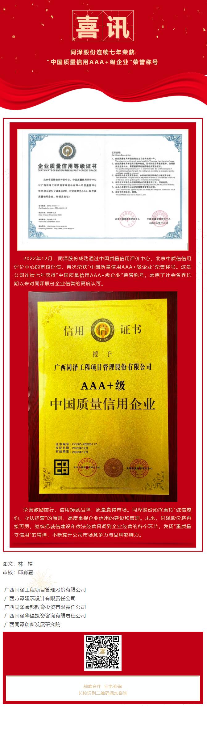 喜訊 | 同澤股份連續(xù)七年榮獲“中國(guó)質(zhì)量信用AAA+級(jí)企業(yè)”榮譽(yù)稱號(hào)